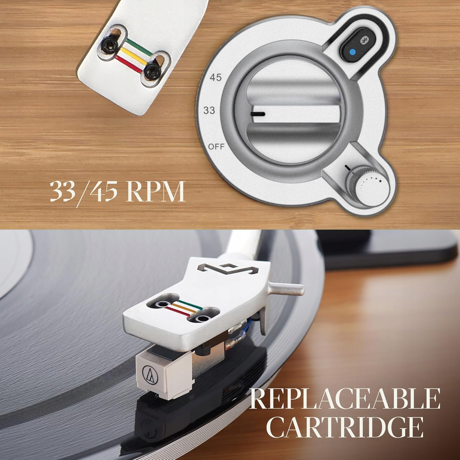 - wireless turntable Stir It Up has an elegant appearance and is made of solid bamboo, Силіконовий регнінд ™, тканина Rewind ™, переробка та алюмінієвий пластик для переробки.
