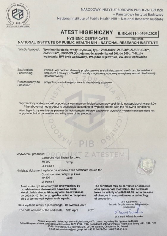 Ми пропонуємо резервуар з гарячою водою з гарячою водою має гігієнічний сертифікат PZH , виданий Національним інститутом громадського здоров’я . Це означає, що пристрій був точно тестування в лабораторії , а відповідає всім стандартам, пов'язаним із безпекою використання.