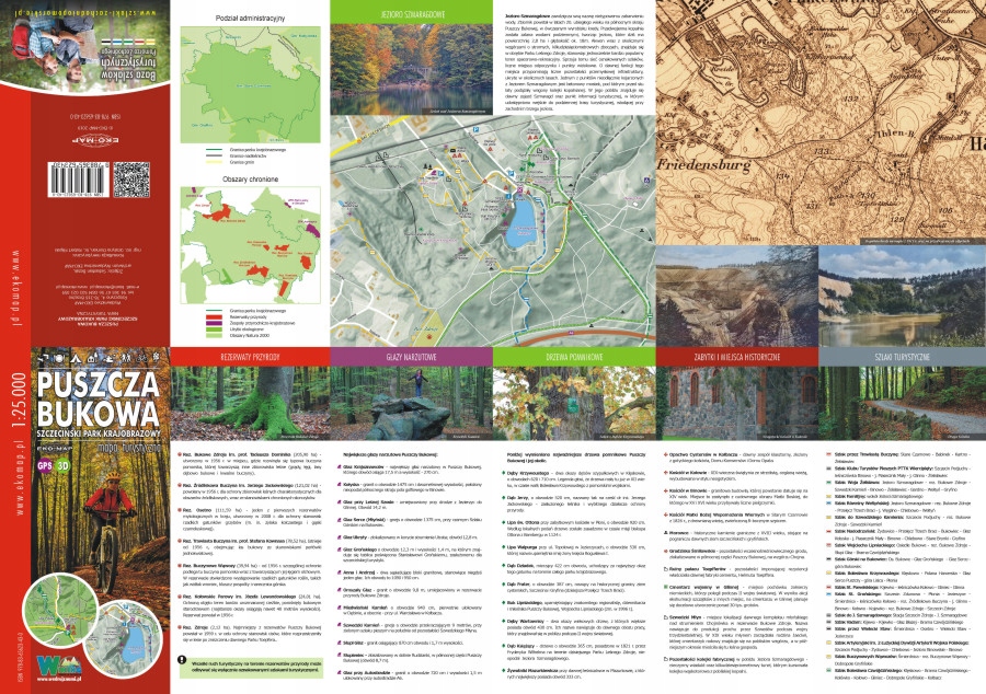 Карта містить понад 250 км пішохідних стежок, якими користуються тисячі жителів Щецина та околиць, а також приїжджі туристи. Наше видання являє собою карту масштабу 1:25 000, яка охоплює територію ландшафтного парку та його найближчі околиці. Окрім стандартної топографії, на карті є маршрути всіх позначених туристичних стежок, розташування валунів і найважливіших дерев-пам’ятників, а також багато історичних цікавинок: пам’ятники, довоєнні кладовища, руїни старих будівель. Там, де це було можливо, німецькі назви гір, доріг, міст і струмків наводилися в лапки.