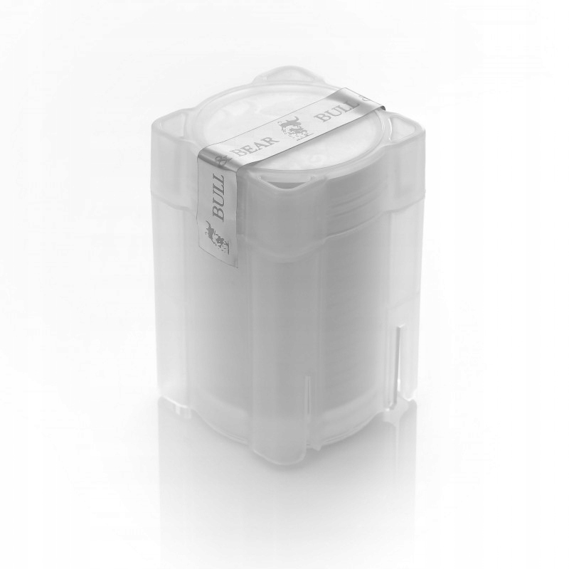 Тюба, що містить 20 штук монет Bull&Bear. Другий рік випуску срібних монет в 1 унцію з чистотою 0,999. Номінальна вартість 5000 франків, визнана законним платіжним засобом у Республіці Чад.