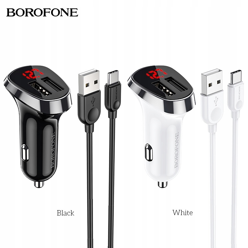 BOROFONE BZ15 Auspicious – це автомобільний зарядний пристрій із двома USB-портами потужністю 2,4 А кожен, загальна потужність 2,4 А максимум, додатково оснащений світлодіодним дисплеєм, який показує стан акумулятора автомобіля на стоянці та після запуску двигуна, силу струму та ампер під час заряджання мобільного пристрою, а також кабель 1M USB Type-C, призначений для зарядки мобільні пристрої з Android, такі як та інші, обладнані таким роз’ємом.