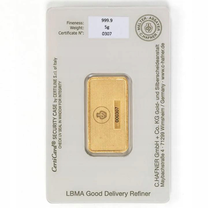 Злиток золота вагою 5 грамів є інвестиційним продуктом від відомого виробника дорогоцінних металів C. Hafner і є ідеальним вибором для інвесторів, які шукають фізичний актив престижний характер. Золотий злиток виготовлений із чистого золота 999,9 проби та має сертифікований захист CertiPack. Варто додати, що емітент золотого злитка акредитований LBMA, завдяки чому надає своїй продукції максимально можливу гарантію якості.