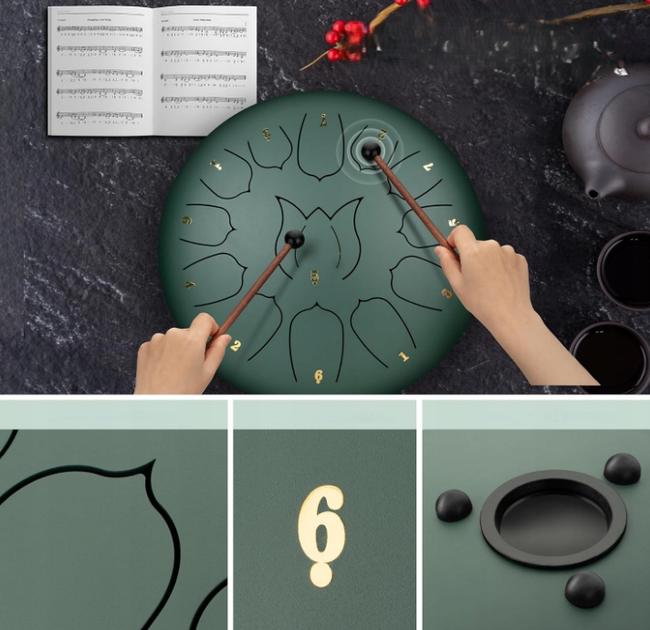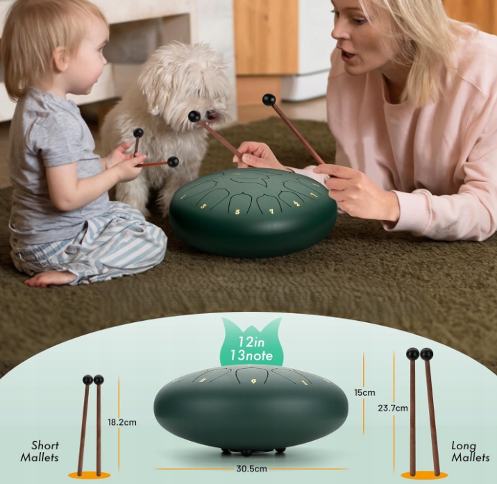 12 дюймів, 13 банкнот: 12-дюймовий сталевий барабан із 13 банкнотами. Немає складної системи теорії музики, вона проста і легка для вивчення. Набір включає ноти, щоб початківцям було легше вчитися та розважатися.