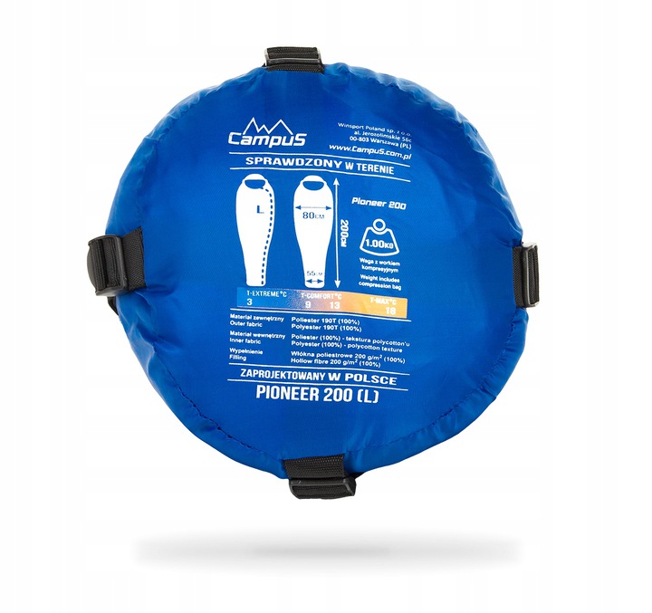 Високоякісний спальний мішок PIONEER 200 від Campus. Ця модель є класичним зразком спального мішка мумії. Він характеризується чудовою якістю виготовлення та інноваційним дизайном. Тришарова конструкція забезпечує комфортний сон при температурі від +9 до +13 °C. Завдяки своїй конструкції спальник можна використовувати як під час кемпінгу, так і в туристичних подорожах. Спальник має можливість з'єднання.