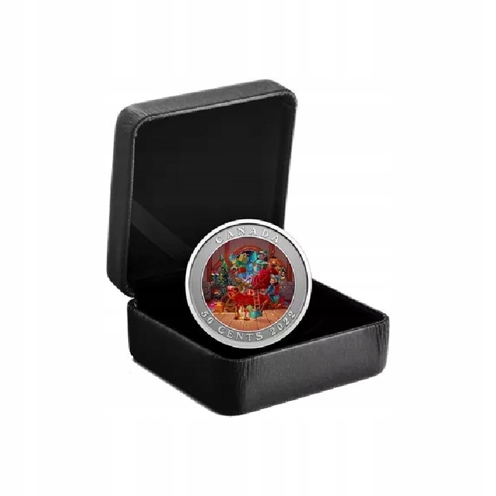 Канада: кольорові сани Санти 50 центів 2022 модифікований зразок лінзоподібної монети є предметом, який стосується Різдва. На виробі показано, як працьовиті ельфи Санти завантажують іграшки та коробки з подарунками на його чарівні сани на Північному полюсі напередодні Різдва.