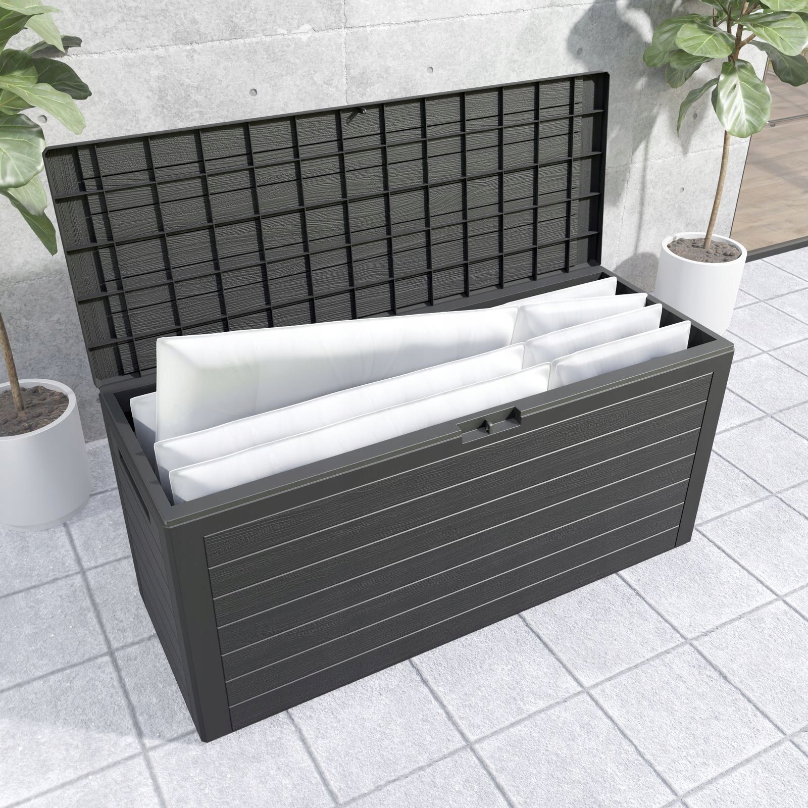 Стійкий до погодних умов пластиковий ящик для подушок має кришку, що замикається, із вбудованим замком для безпечного зберігання.