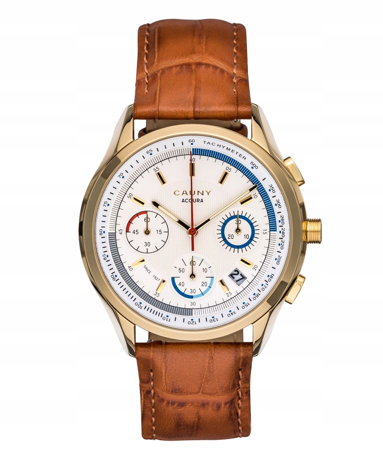 - Хронограф Cauny®, CAC001, колекція Accura. Вираз спортивного духу Кауні. Неспокійний годинник за своєю природою, готовий пірнати та зіткнутися з природою. Технологічно просунута колекція з точним хронографом і надійним механізмом із функцією Super Runner. Ідеальна гармонія між технологією та дизайном. Бестселер Cauny, ідеальний для щоденного використання. Класичний лінійний дизайн з кварцовим механізмом. Корпус і безель із золотої сталі 316L, Ø 42 мм. Бежевий циферблат з візерунком вертикальної лінії. Вікно з днем місяця. Люмінесцентні стрілки для видимості вночі. Сапфірове скло з антибліковим покриттям. Водонепроникність до 10ATM. Браслет із верблюжої шкіри із застібкою. Елегантність, якість і витонченість за доступною ціною, якими швейцарський бренд продовжує нас дивувати!