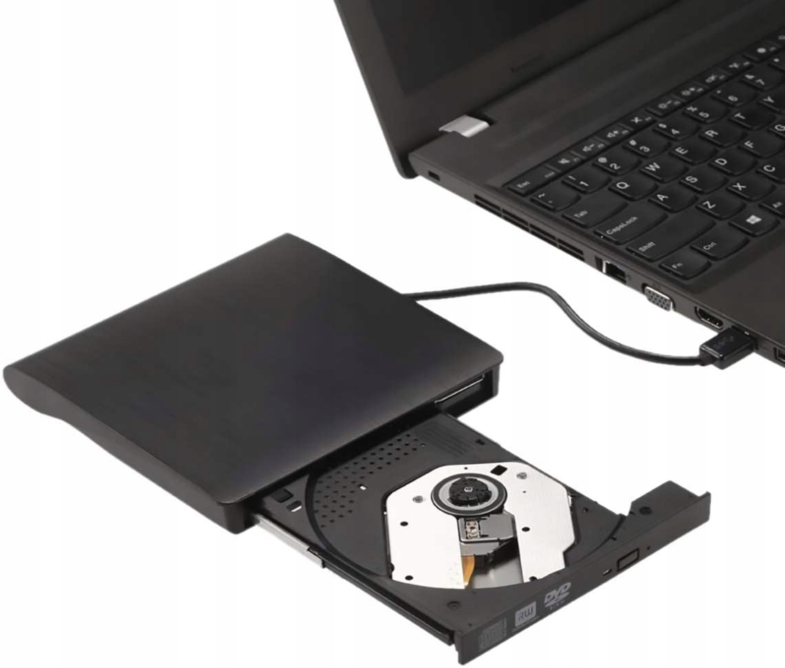 Функціональний портативний зовнішній DVD-RW рекордер у чорному елегантному корпусі.