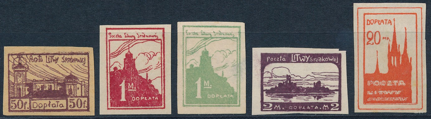 ЦЕНТРАЛЬНА ЛИТВА Видання 1921 р. Вільнюс доплатна серія проб марок без зубців!!!