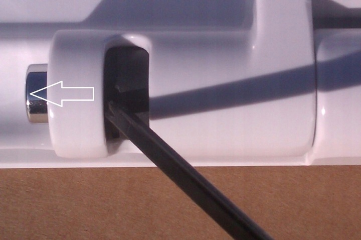 через отвір, який використовується для кріплення сидіння до металевої шпильки, прикрученої до унітазу - малюнок нижче.