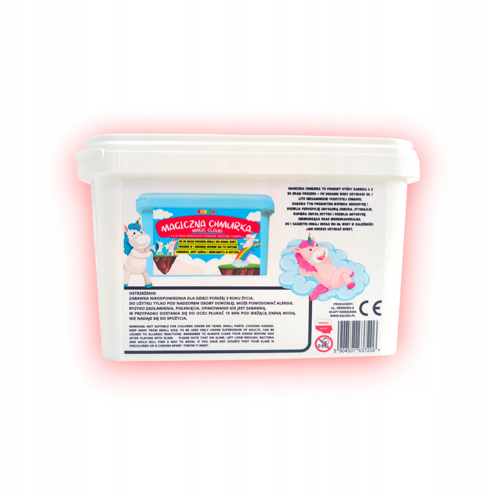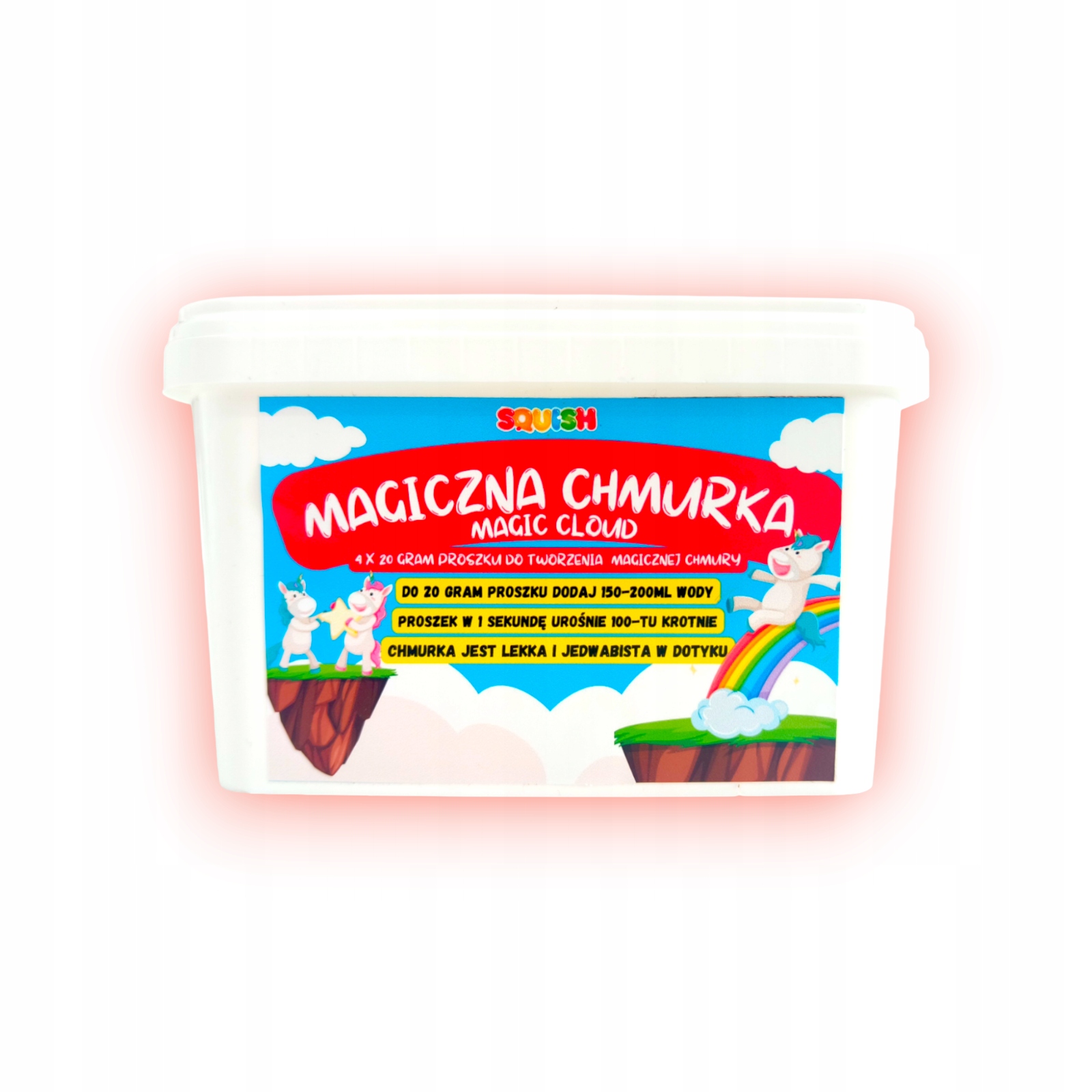 ЧАРІВНА ХМАРА, що росте під дією води від SQUISH™ це останній хіт для творчих і експериментальних ігор! MAGIC CLOUD - це продукт, який містить 80 грамів порошку. Після додавання води ви отримаєте приблизно 3 літри неймовірно пухнастої хмари. Гра з цим продуктом підтримує сенсорні навички та розвиває розумове сприйняття дитини. Він стимулює, підтримує відчуття дотику та розвиває моторику. Не залишає слідів і біологічно розкладається.