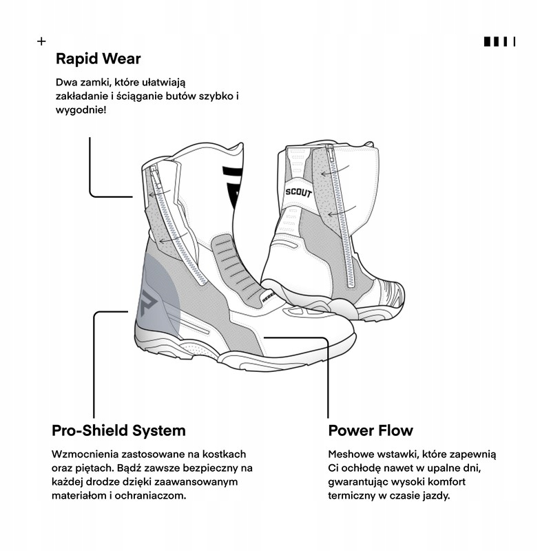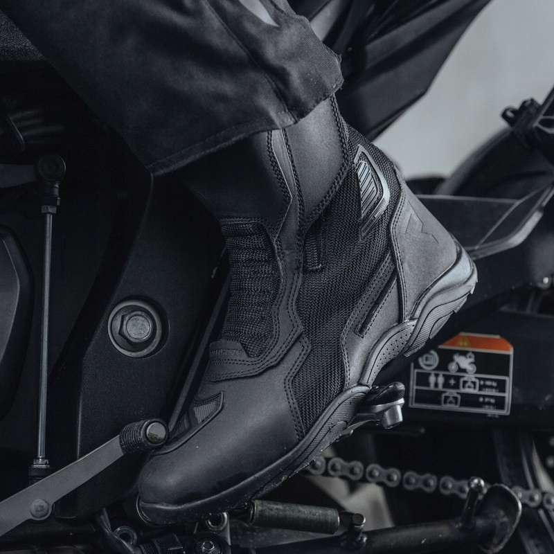 Туристичні мотоциклетні черевики Rebelhorn Scout Air - це пропозиція для літніх подорожей і подорожей у теплі краї. 3D сітчаста підкладка чудово відводить вологу, а антибактеріальна вставка забезпечує свіжість. Rebelhorn Scout Air оснащено захистом для щиколоток і посиленням п'яти.
