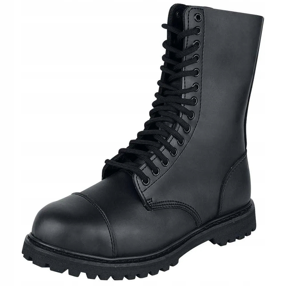 Ці міцні та зручні черевики bovver для жінок і чоловіків (так звані унісекс) Brandit Phantom виготовлені зі натуральної шкіри та мають десять люверсів, сталевий захисний шар покриття та протиковзка, гвинтова та клеєна гумова підошва.