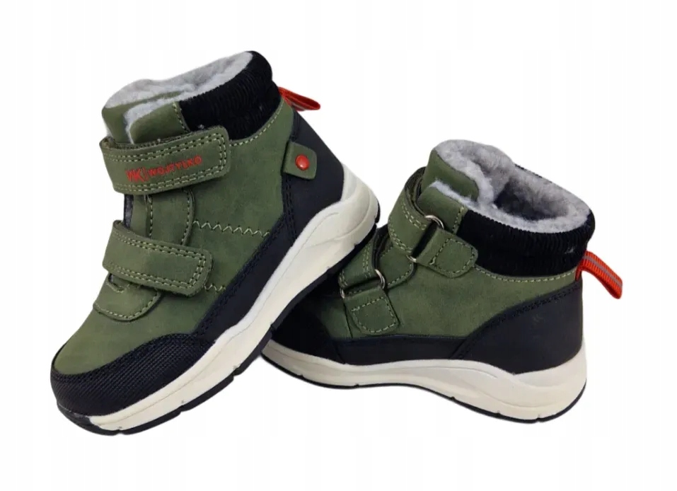 Функціональні та дуже теплі дитячі чобітки. Внутрішня частина взуття обшита м'яким і густим хутром, який ефективно захищає ногу від морозу і зберігає приємне тепло. Дві широкі ремені на липучках дозволяють дитині або батькам швидко і легко взути взуття і ідеально облягати ногу навіть на більш товстих носках. Міцна, легка підошва з нековзким покриттям забезпечує відмінне зчеплення зі слизькими поверхнями. Верх виготовлений із легкого у догляді матеріалу (імітує нубук/матову шкіру) модного відтінку зеленого хакі, стійкого до вологи.