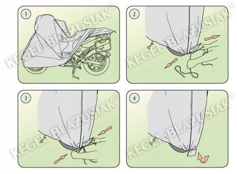 Чохол слід розмістити на відносно чистому мотоциклі білою стороною центрального ременя всередину, потім якомога міцніше натягнути трос знімача кришки та належним чином зав’язати його. Лише правильна шнурівка гарантує довговічність прив’язки.