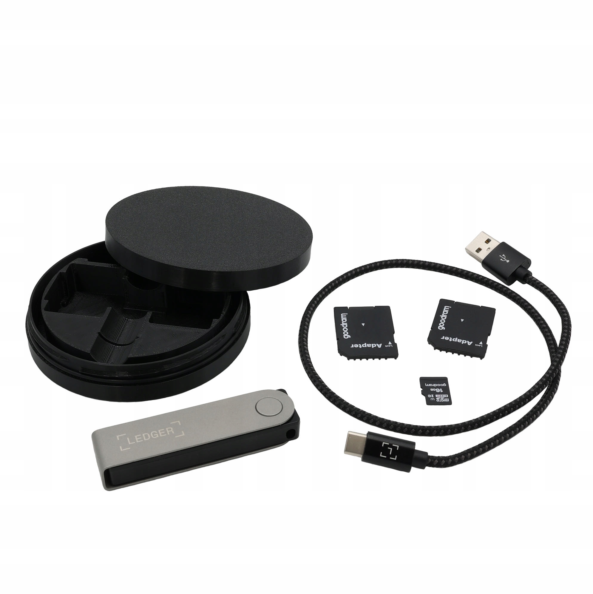 Кейс Ledger і кабель живлення – це відсік, у який можна розмістити дві карти SD і одну карту micro SD b>. Це дозволяє зберігати додаткові дані, резервні копії чи іншу важливу інформацію в одному місці.