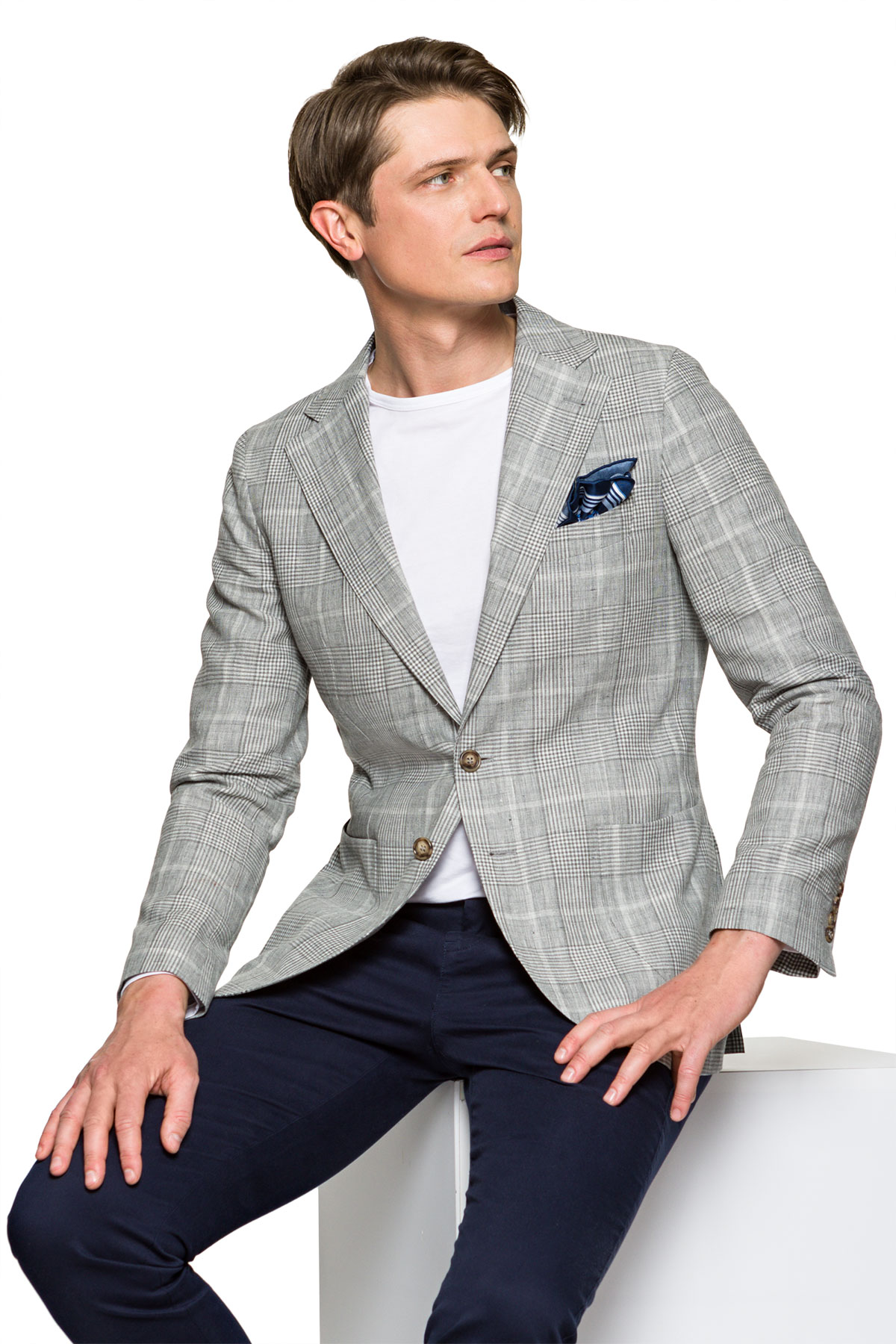 Блейзер у нігерійську клітку є ідеальним вибором для літа, особливо тому, що він походить від limited колекція LANCERTO&MR.VINTAGE, створена у співпраці з Міхалом Кендзьорою, автором блогу MR.VINTAGE. Піджак ми пошили з оригінальної сірої тканини в клетку принца Уельського.