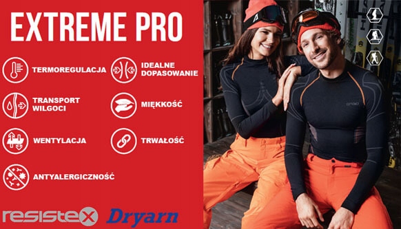 Extreme Pro -це серія безшовної, швидкої термоактивної білизни, розробленої для зимових видів спорту та занять на свіжому повітрі, особливо при низьких температурах. Він був виготовлений лише з синтетичної високоякісної пряжі (включаючи надзвичайно легкий барабан), з відмінними технічними властивостями. Завдяки їм, це гарантує максимальний комфорт, який дозволяє вам зосередити увагу на спортивній діяльності. Завдяки матеріалу, що характеризується тривимірною гнучкістю та м'ясистою структурою, нижня білизна дозволить вам підтримувати повну свободу руху та ефективно захищати від холоду. Захист від бактерій, відповідальних за неприємний запах, був гарантований завдяки іонам срібла, які зустрічаються у всіх надмірно потовидіючих зонах. Подальші переваги нижньої білизни Extreme Pro - це його терморегуляторні властивості, що дозволяє підтримувати організм при оптимальній температурі, а також підвищення довговічності та стійкості до деформації та подушання, щоб легко підтримувати її у великому стані тривалий час.