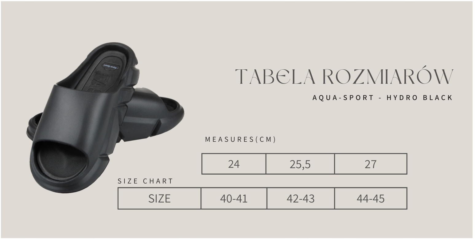 Шльопанці Aqua-Sport Hydro Black — універсальна модель, яка підходить для використання на пляжі та в басейні. Шльопанці виготовлені з легкого, гнучкого матеріалу, який забезпечує хорошу амортизацію та прилягає до форми стопи. Широкий ремінь добре тримає ногу. Матеріал клапанів стійкий до пошкоджень, швидко сохне і не вбирає воду.