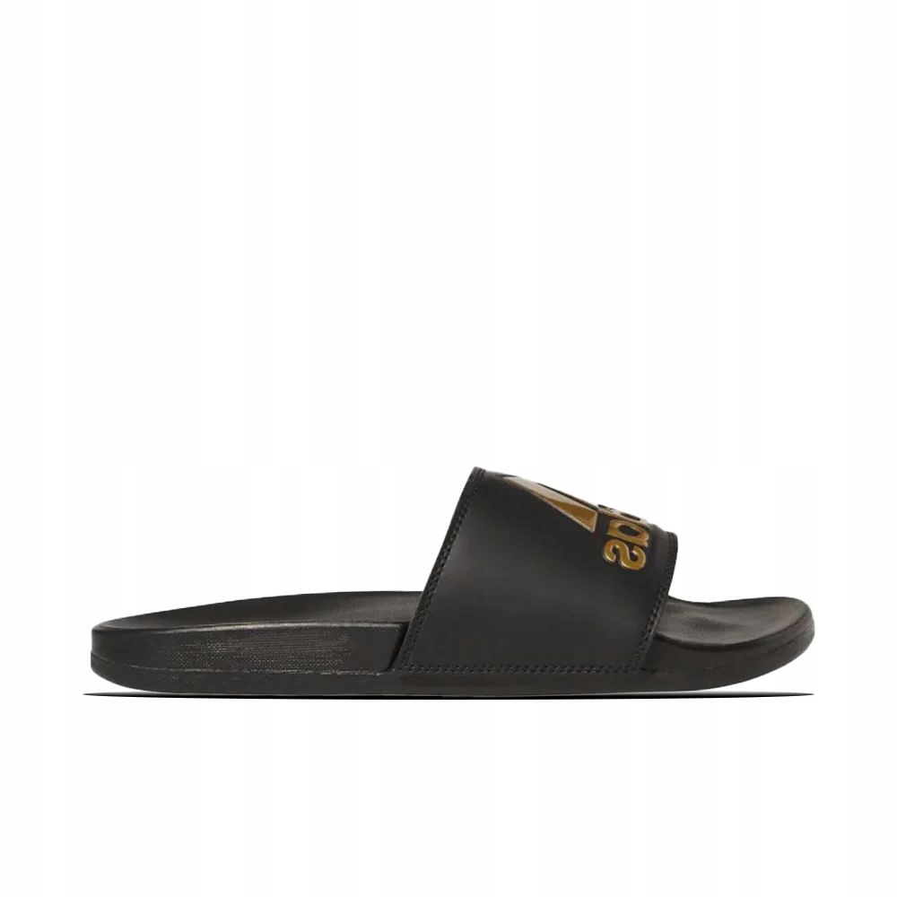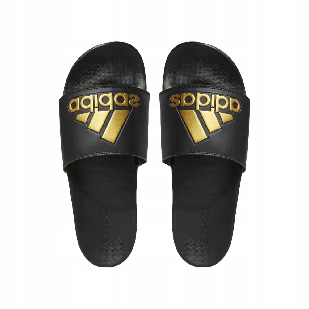 Нові шльопанці Adidas Adilette Comfort чорного кольору із золотим логотипом. М’який верхній ремінь і контурна устілка забезпечують комфорт, яким славляться шльопанці. Не використовуйте в душі чи басейні.