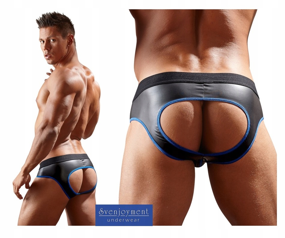 Чоловічі труси з відкритими сідницями з чорного матеріалу, дуже схожого на неопрен.