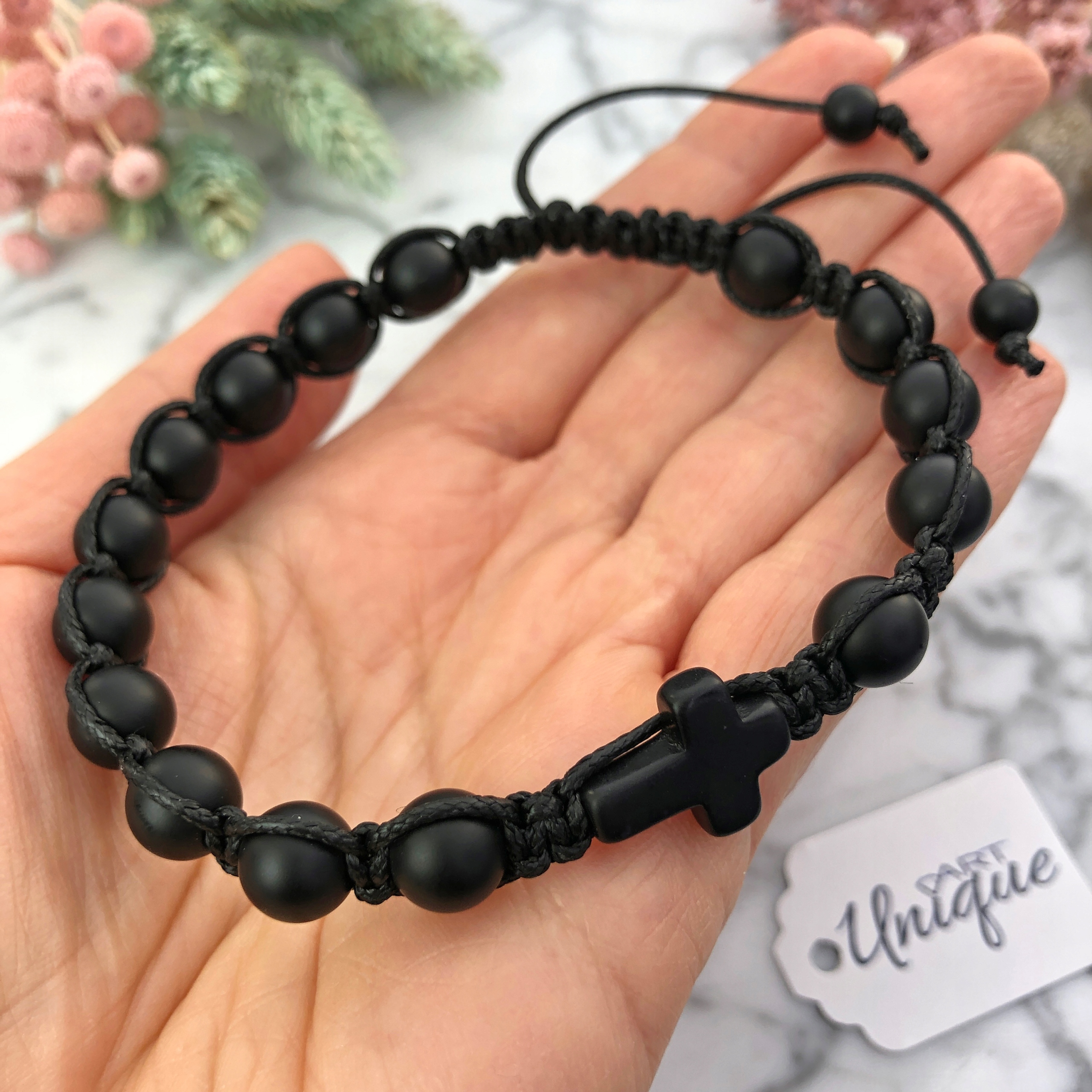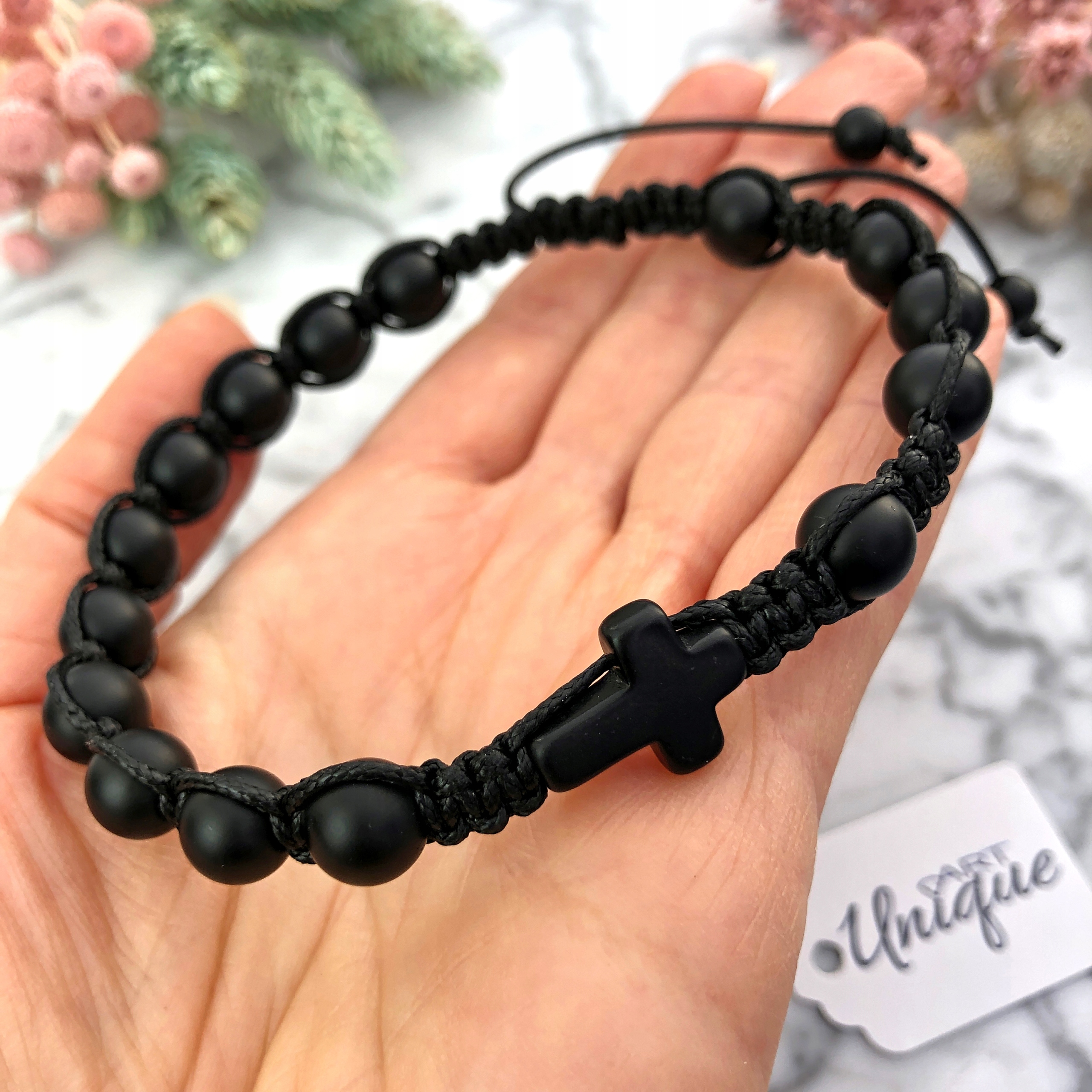 Браслет з натурального декоративного каміння - чорний матовий онікс методом плетіння макраме з нитки високоякісних волокон з підвищеною стійкістю до стирання та вода .