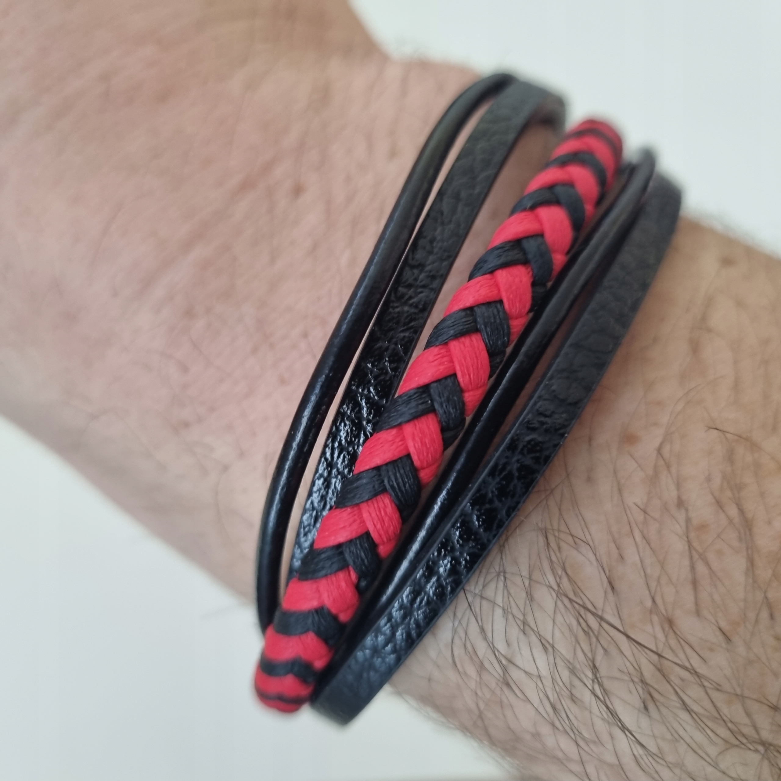 Браслет з високоякісної шкіри та нержавіючої сталі. Складається з чотирьох чорних ремінців і червоної плетеної частини. Зручна і швидка застібка зі сталі забезпечує винятковий комфорт при носінні щодня.