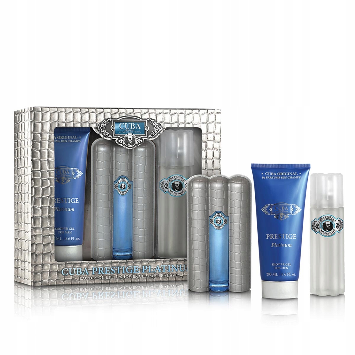 CUBA PRESTIGE PLATINUM — деревний ароматний аромат, створений CUBA PRESTIGE для чоловіків, які відмовляються від традиційних кодів і стандартів. Цей особливий парфум поєднує в собі свіжість цитрусових нот і силу деревного аромату. Верхні ноти: бергамот, грейпфюр, лимон, яблуко та мандарин. ЧОЛОВІЧИЙ НАБІР CUBA PRESTIGE PLATINUM 3 PCS SET включає :
