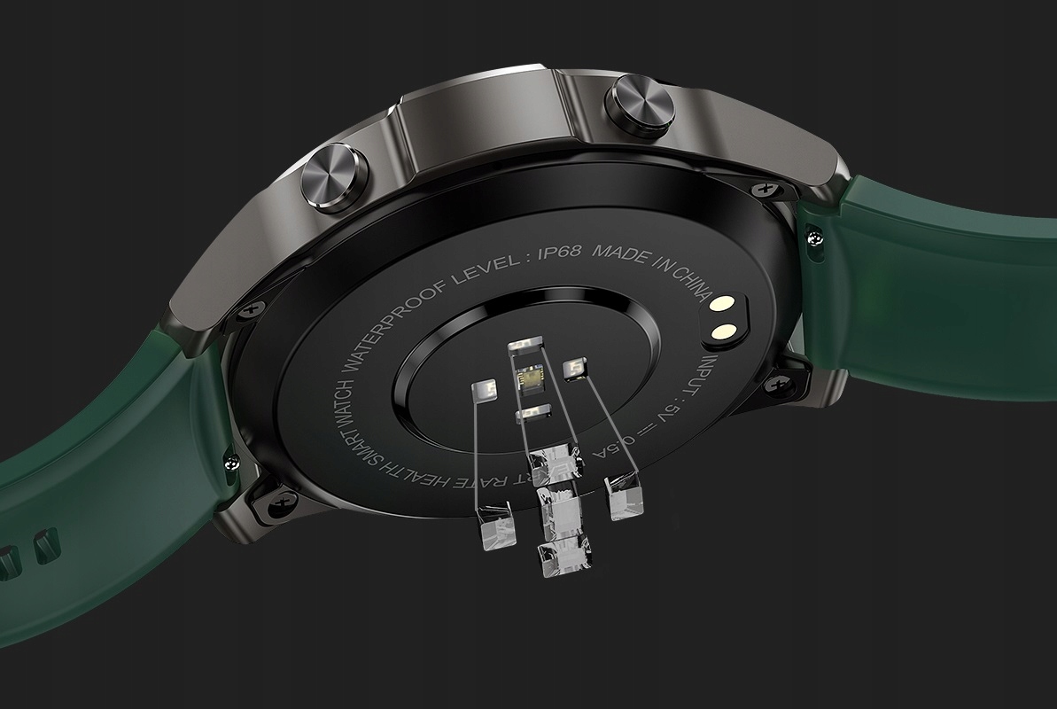 Розумний годинник має встановлений датчик вимірювання третього поколінняі оснащений трьома світлодіодами пульсометра із зеленим світлом.