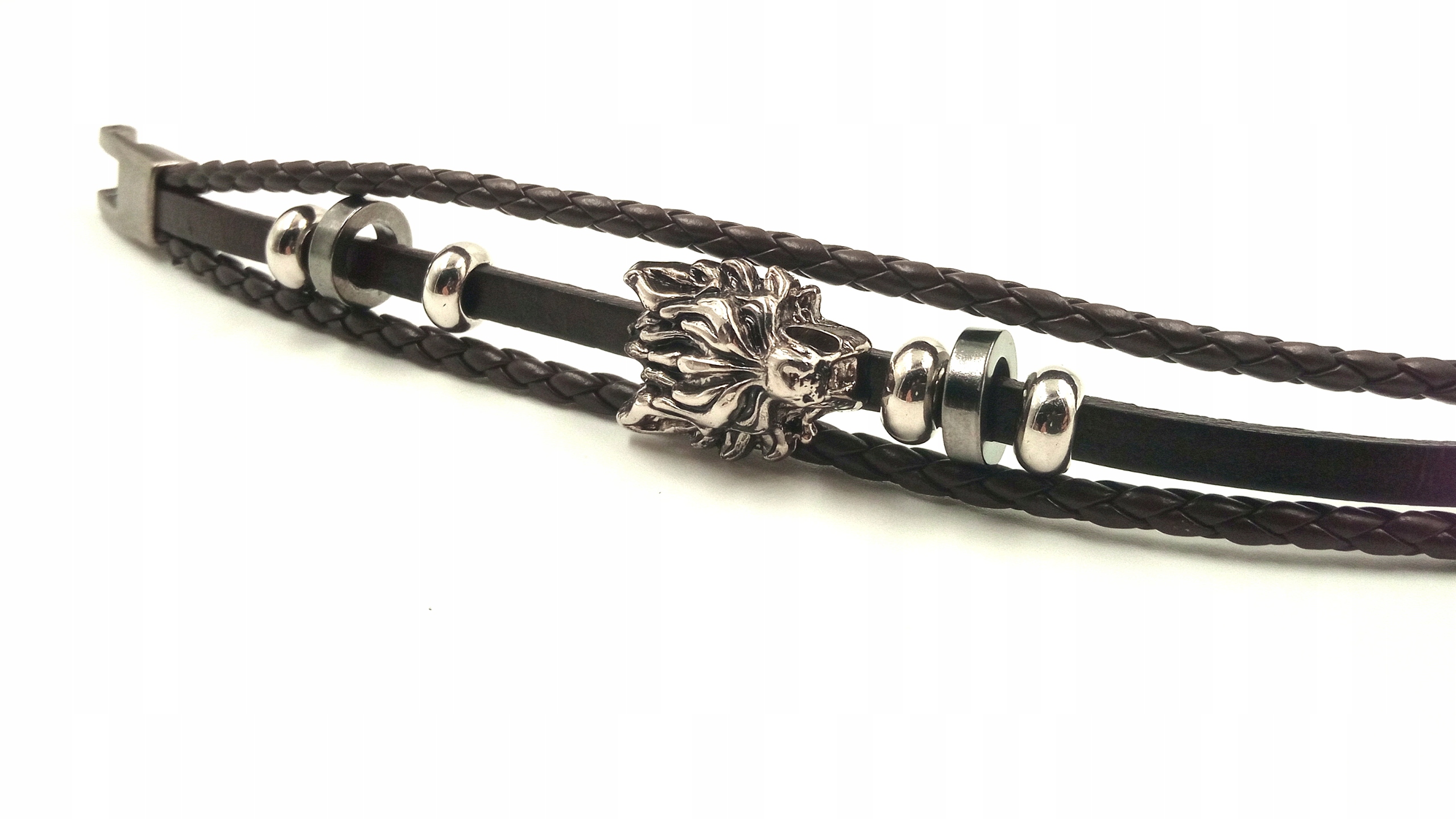Набір із трьох чоловічих браслетів з екошкіри, ручного плетіння, з металевою застібкою та вовк