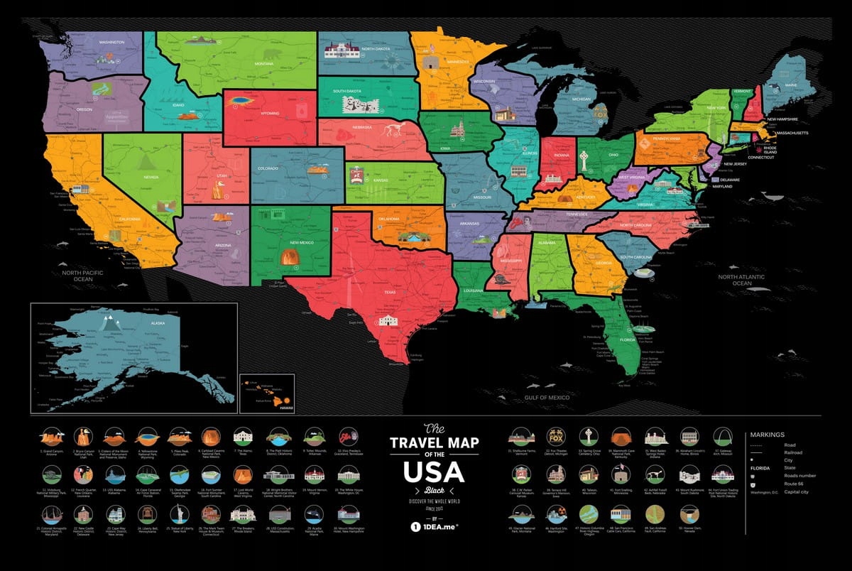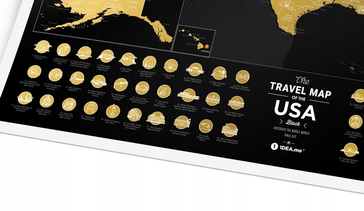 Travel Map™ USA Black — це чорна карта Сполучених Штатів із золотистим покриттям. Ви можете легко позначити на карті штати, які ви відвідали, і знайти їх символи. Просто скористайтеся доданим кубиком, щоб вийняти золоту скретч-картку та відкрити для себе місця, де ви вже були, створивши вражаючий запис своїх подорожей США. Карта підходить для сучасних і креативних інтер'єрів. Вона також підійде як подарунок любителям США.