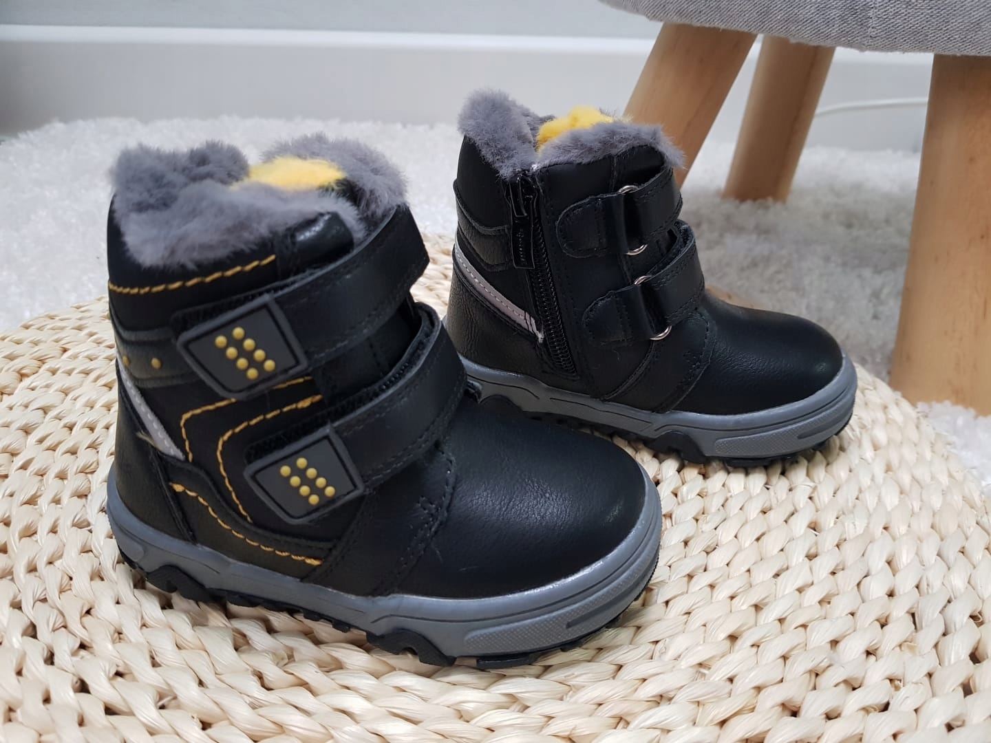 Це взуття виготовлене з екологічної шкіри, яка є міцною та легкою у догляді. Вони кріпляться на більш товсту підошву з протектором, який захищає ноги від холоду та вологи та забезпечує хороше зчеплення з землею. Взуття утеплене овчиною. Вони мають застібку-блискавку та липучку, тому кожен хлопчик легко їх знімає та одягає.