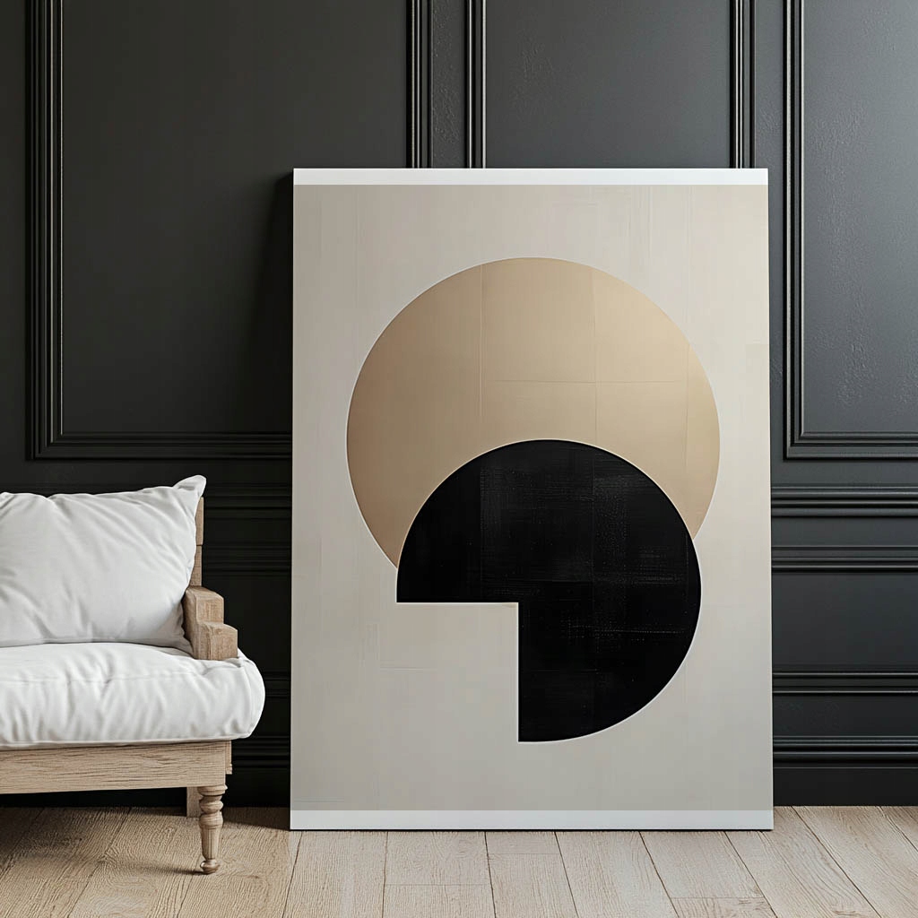 плакат під назвою "Золота гармонія: чорний простір" представляє Золоте коло, в якому центр займає чорне колесо з дефектом у формі чверті. Ця абстрактна композиція поєднує контрастні золоті та чорні кольори, що надає йому сучасного характеру, підкреслюючи витонченість та глибину. Золоте колесо символізує повноту та вдосконалення, тоді як дефект у чорному колі може трактувати як символ мінливості, відмінностей та еволюції. Цей унікальний витвір мистецтва ідеально відповідатиме сучасним інтер'єрам, приносячи їм витончений художній елемент.