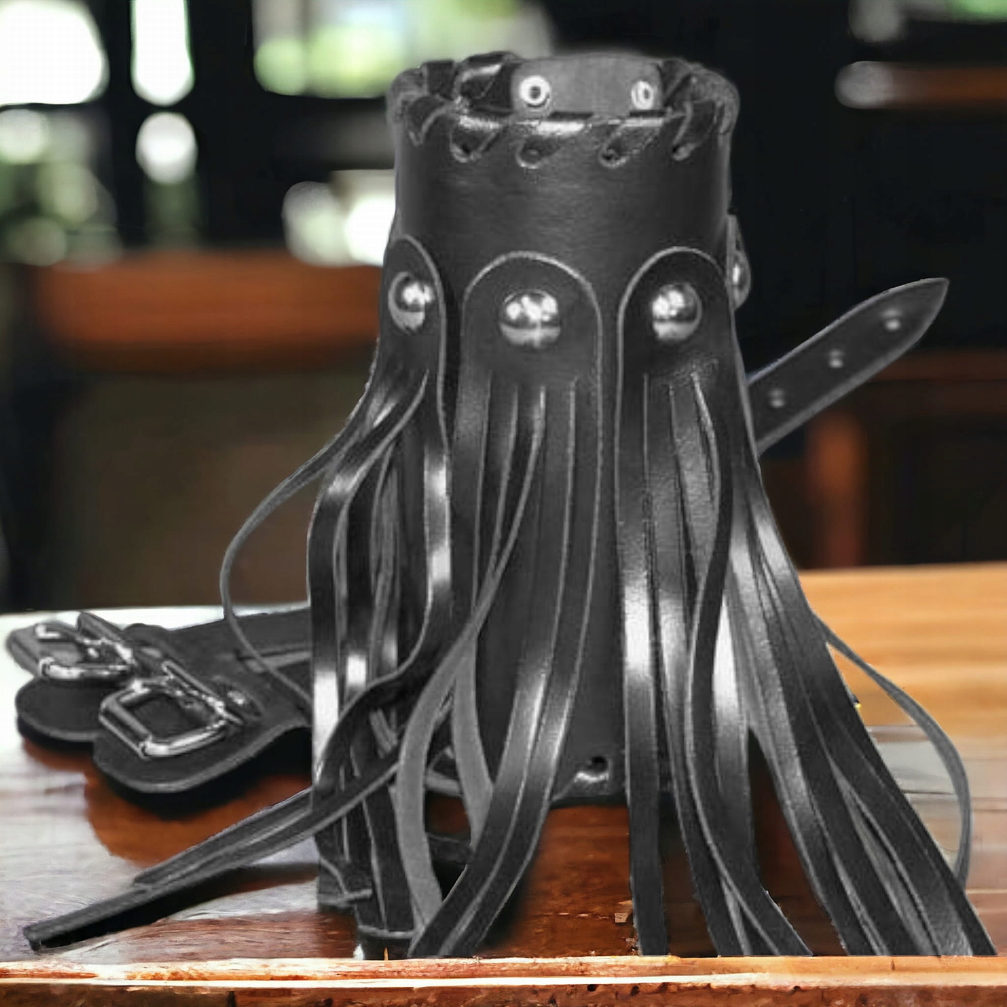 ⚠️Чорний шкіряний мотоциклетний тримач для пляшок - з бахромою