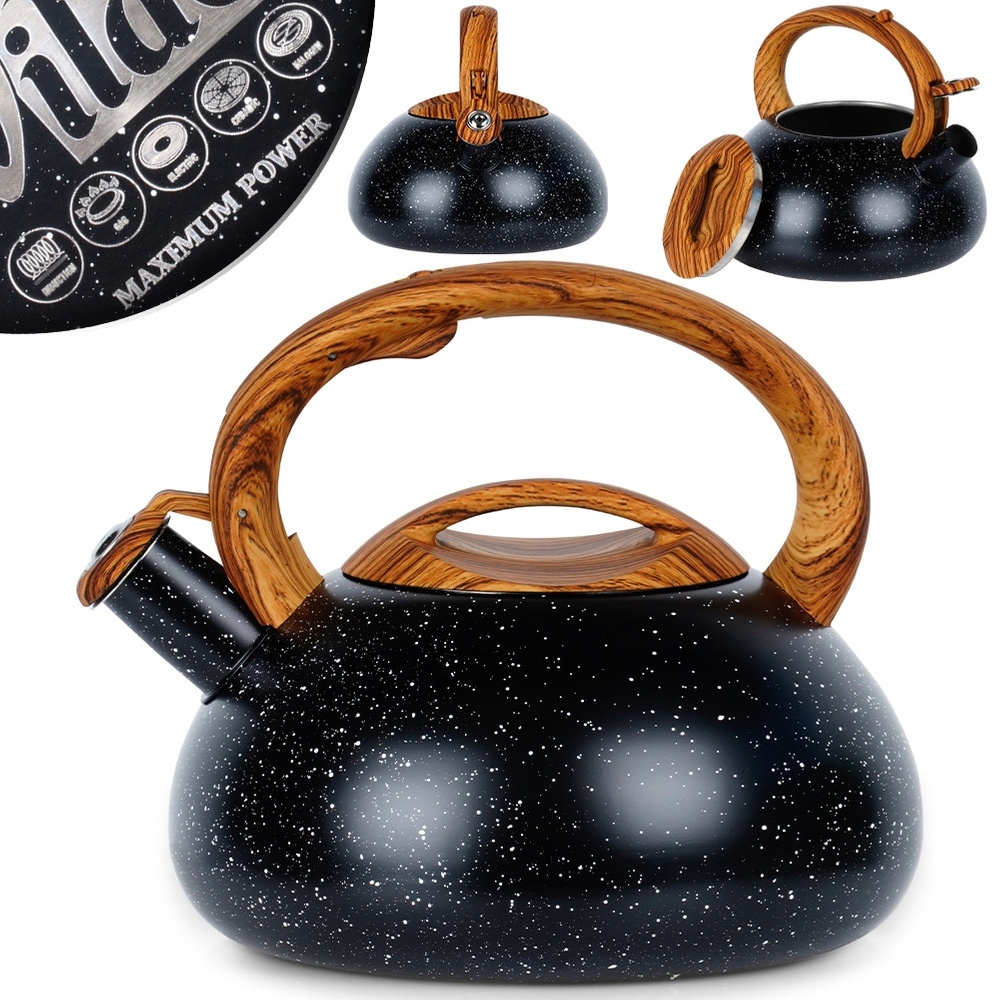 ✅ Чайник з нержавіючої сталі - Класичний чайник з нержавіючої сталі найвищої якості. Він чорного кольору з білою крапчастою поверхнею, що імітує граніт. Нержавіюча сталь міцна і нейтральна до нагрітої води, це ніяк не впливає на її властивості. Має автоматичний свисток і знімну кришку. Чайник має загальний об'єм 3 л і висоту 19 см, корисний об'єм 2,3 л.