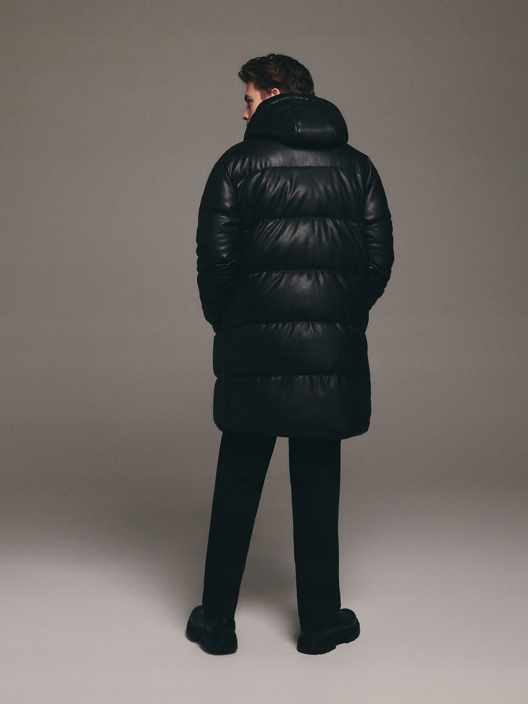 Чорний стьобаний еко -лівий пальто з капюшоном з довгими рукавами кишені m