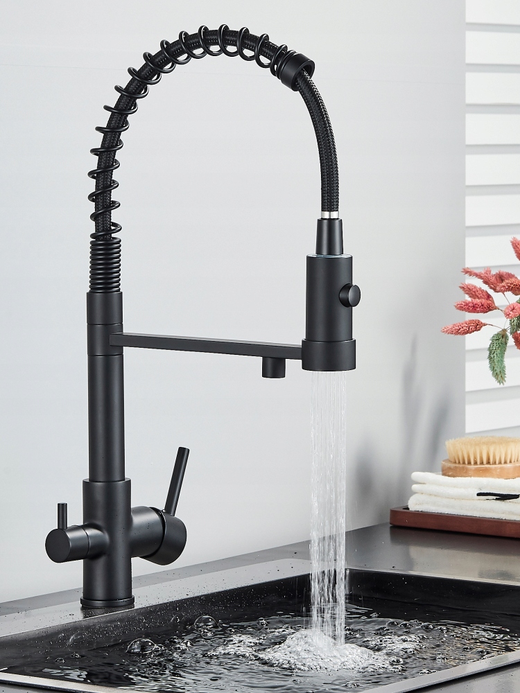 Трьохходовий кухонний змішувач Solid Spring з гнучким виливом - високоякісний пристрій, який використовується на домашній і професійній кухнях. Цей змішувач має два незалежних водяних канали, тому користувач може зручно використовувати гарячу, холодну та фільтровану воду.
