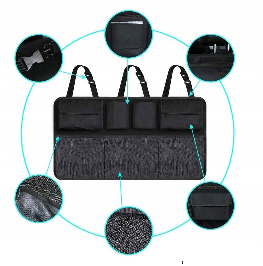★ Багато кишень: Велика конструкція (89,5 х 46 см) Організатор на задній частині автомобіля має достатню ємність. 9 кишень: 4 суцільні та гнучкі сітчасті кишені, 3 кишені, 2 кишені з кріпленнями, які можна легко розмістити в багажнику. Наприклад: вода, інструменти, книги, тканини, парасольки тощо