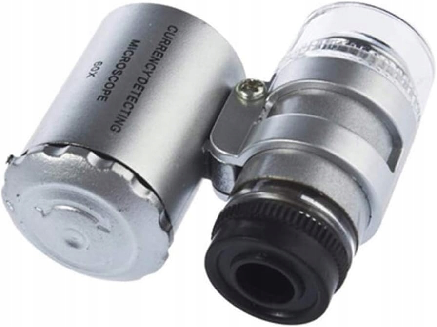 - Дизайн 2 в 1 – збільшувальне скло із 60-кратним збільшенням і УФ-детектор валюти. Стандартне світлодіодне світло допомагає вам чітко бачити, і його можна використовувати в темряві, коли ви не хочете впускати зовнішнє світло, допомагаючи вам знаходити фальшиві купюри.