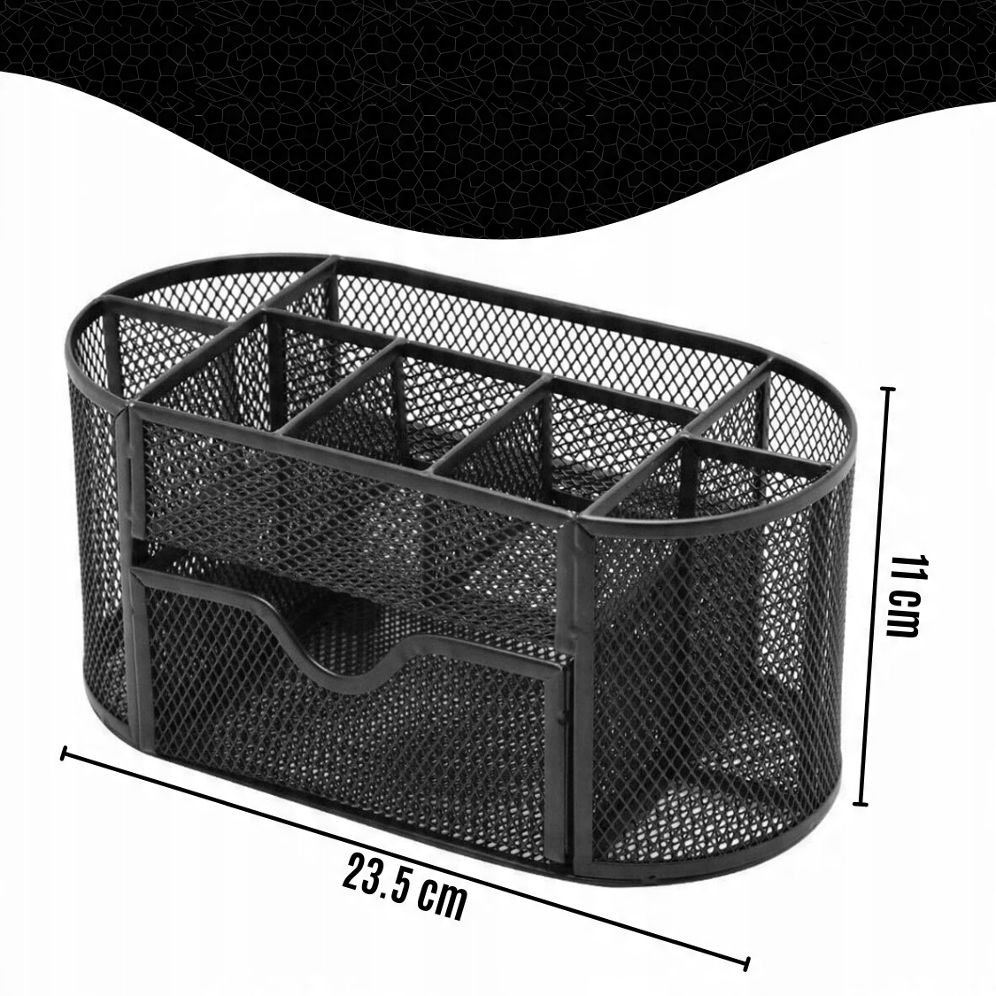 Органайзер має аж 9 відділень, тож ви можете легко сортувати та впорядковувати канцелярське приладдя, наприклад ручки, візитні картки, скоби чи калькулятори. Він виготовлений із міцного та стійкого до пошкоджень лакованого металу, що забезпечує тривалий термін служби та легке очищення.