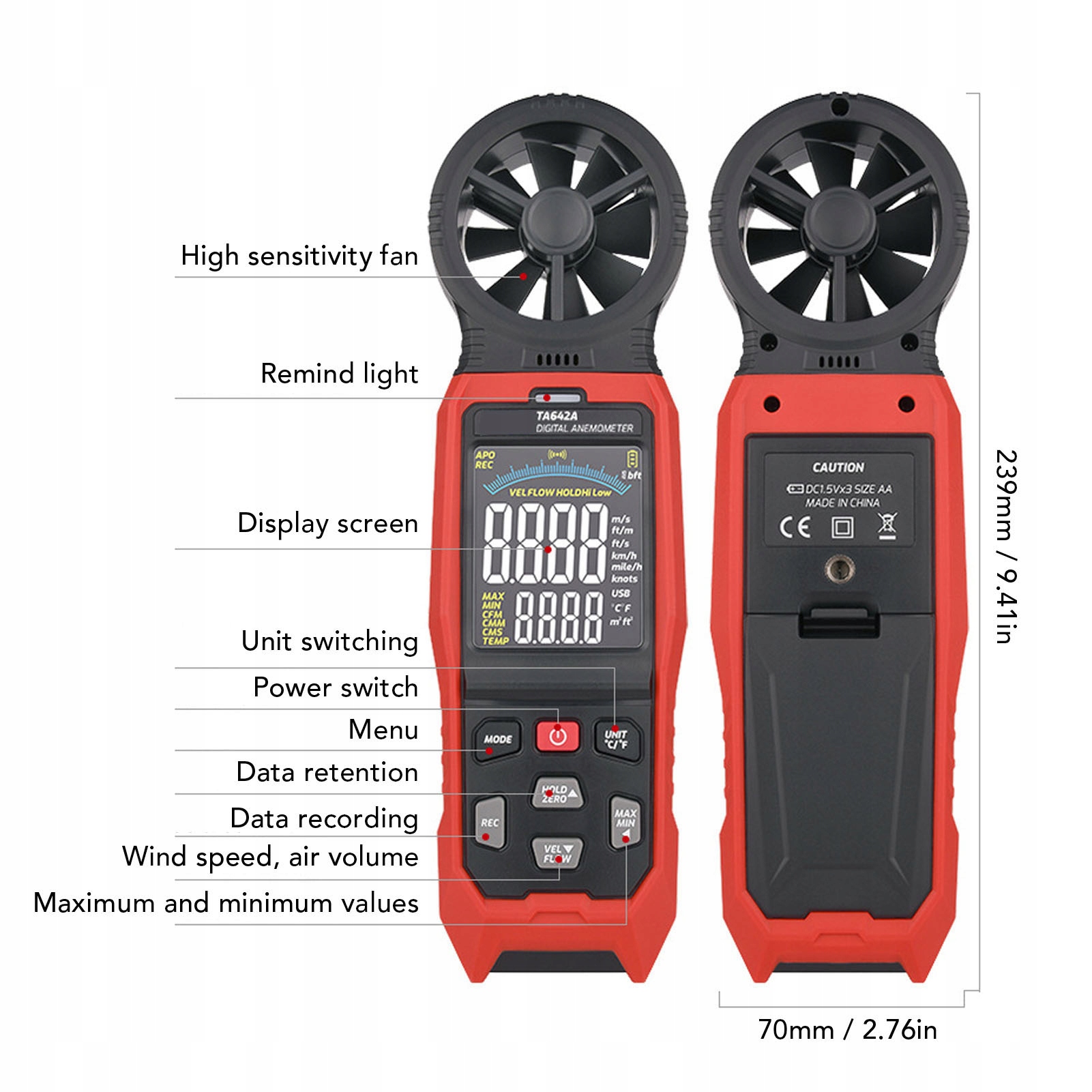 1. Багатофункціональні вимірювання. Наш цифровий анемометр пропонує широкі можливості вимірювання, зокрема швидкості вітру, температури та повітряного потоку, із легким перемиканням між різними одиницями для зручності.