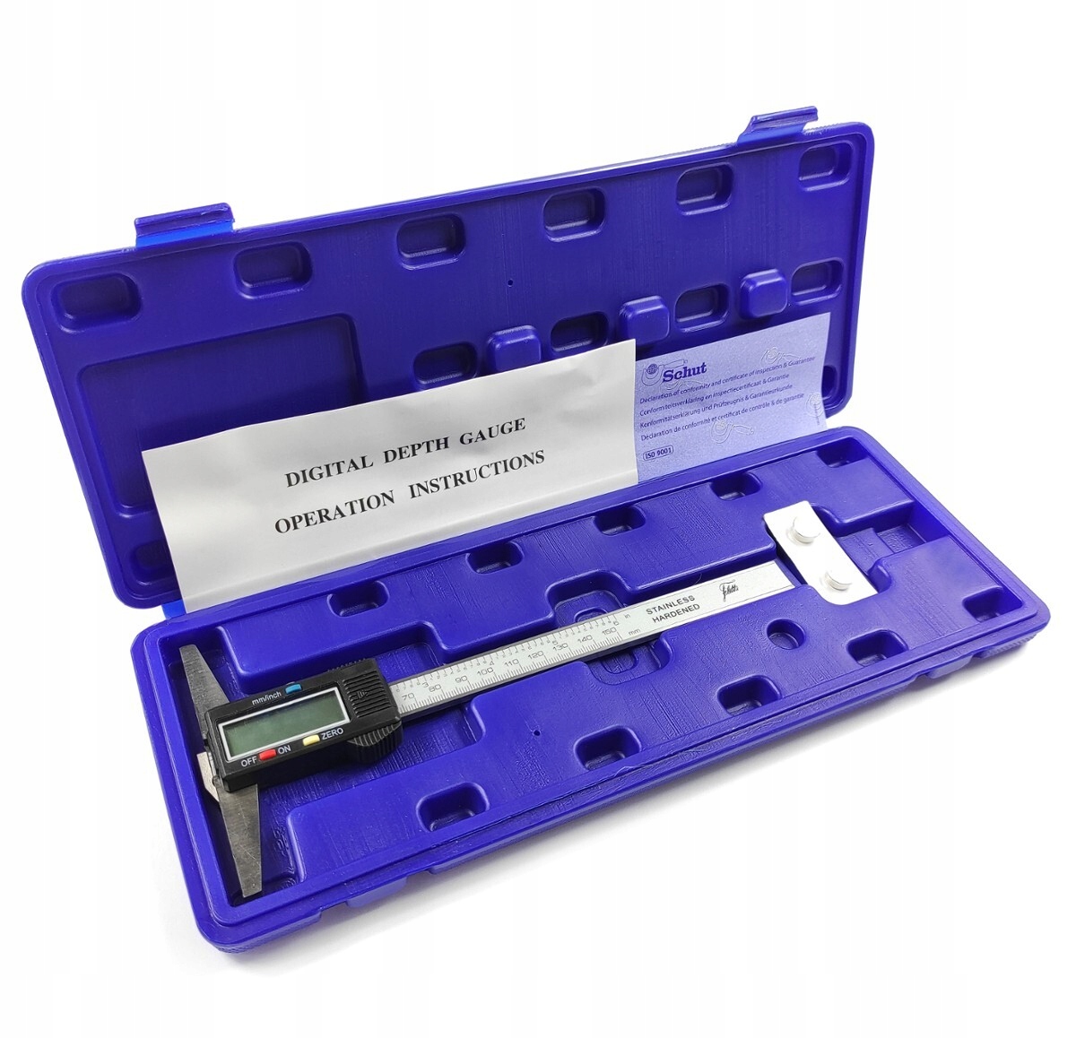 Електронний глибиномір з гачком з діапазоном вимірювання 0-150 мм, роздільною здатністю 0,01 мм і довжиною основа 100 мм. Оснащений фіксуючим гвинтом. Виготовлений з нержавіючої сталі.
