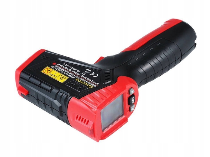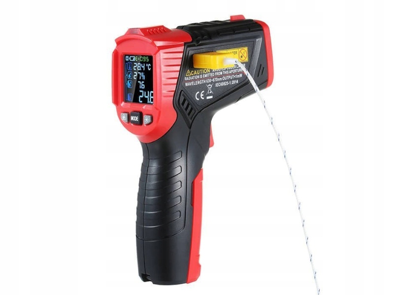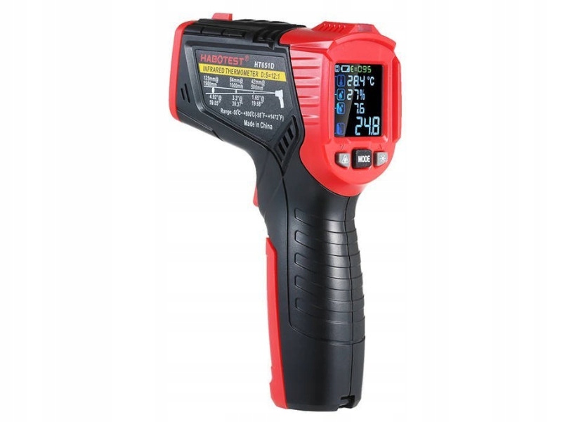 Вбудований РК-дисплей полегшує використання пристрою. Інфрачервоний термометр HT65D дозволяє проводити безконтактні вимірювання в діапазоні від -50°C до 800°C. Широкий діапазон температур дозволяє використовувати пристрій у багатьох сферах застосування. Його також легко транспортувати - його можна сміливо брати з собою куди завгодно. Для живлення потрібна батарея 9 В 6F22.