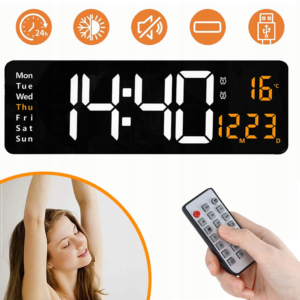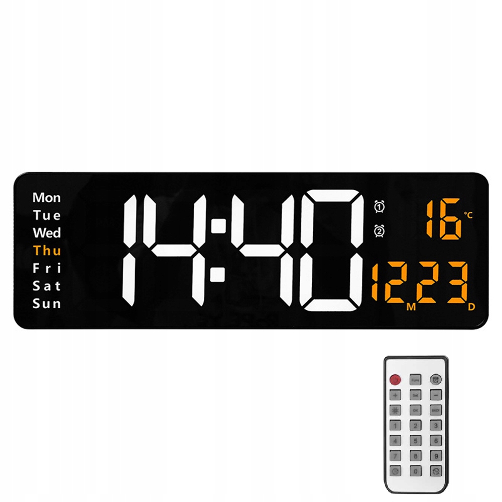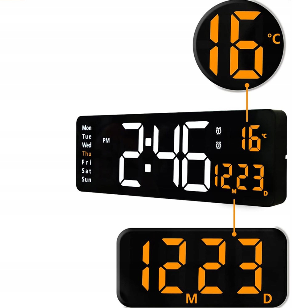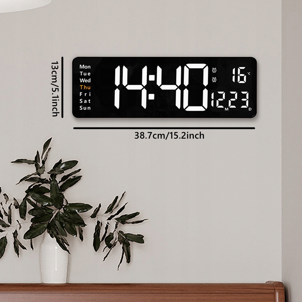 1. Великий цифровий світлодіодний настінний годинник – оснащений 16-дюймовим висококонтрастним дисплеєм і великими цифрами, які добре видно і читаються здалеку та під різними кутами. Цей цифровий настінний годинник відображає час, дату, кімнатну температуру, день тижня та іншу інформацію, що робить його ідеальним для спортивних залів, магазинів, складів, гаражів і офісів.