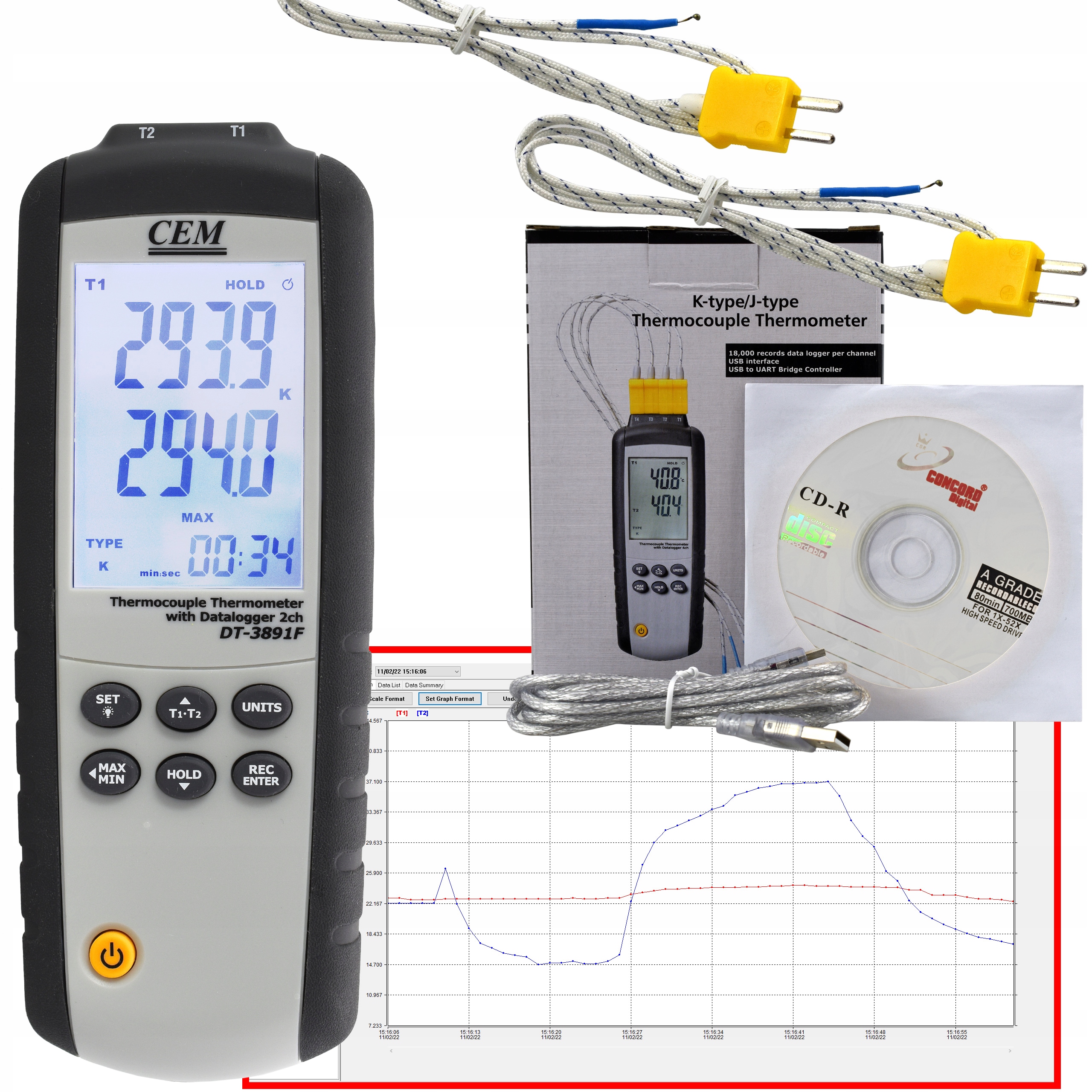 - Стандартне обладнання: 2x K-type temperature кульковий зонд (вимірювання температури повітря) DT-3891F, USB-кабель, компакт-диск із програмним забезпеченням