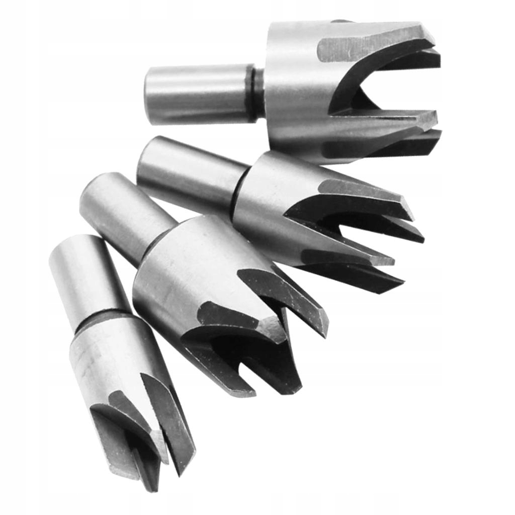 1. Пакет містить: 4 стандартні фрези та 4 фрези з фаскою з 4 зубцями^ 2. Фрези з фаскою створюють конічні заглушки для заповнення отворів.^ 3. Розміри діаметрів включають 6 мм/10 мм/13 мм/16 мм (1/4", 3/8", 1/2", 8/5")