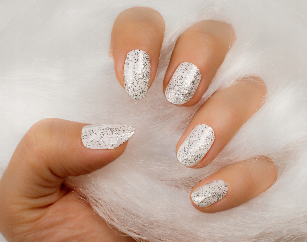 Гібридні лаки для нігтів, що переливаються, з меншими та більшими частинками блиску.