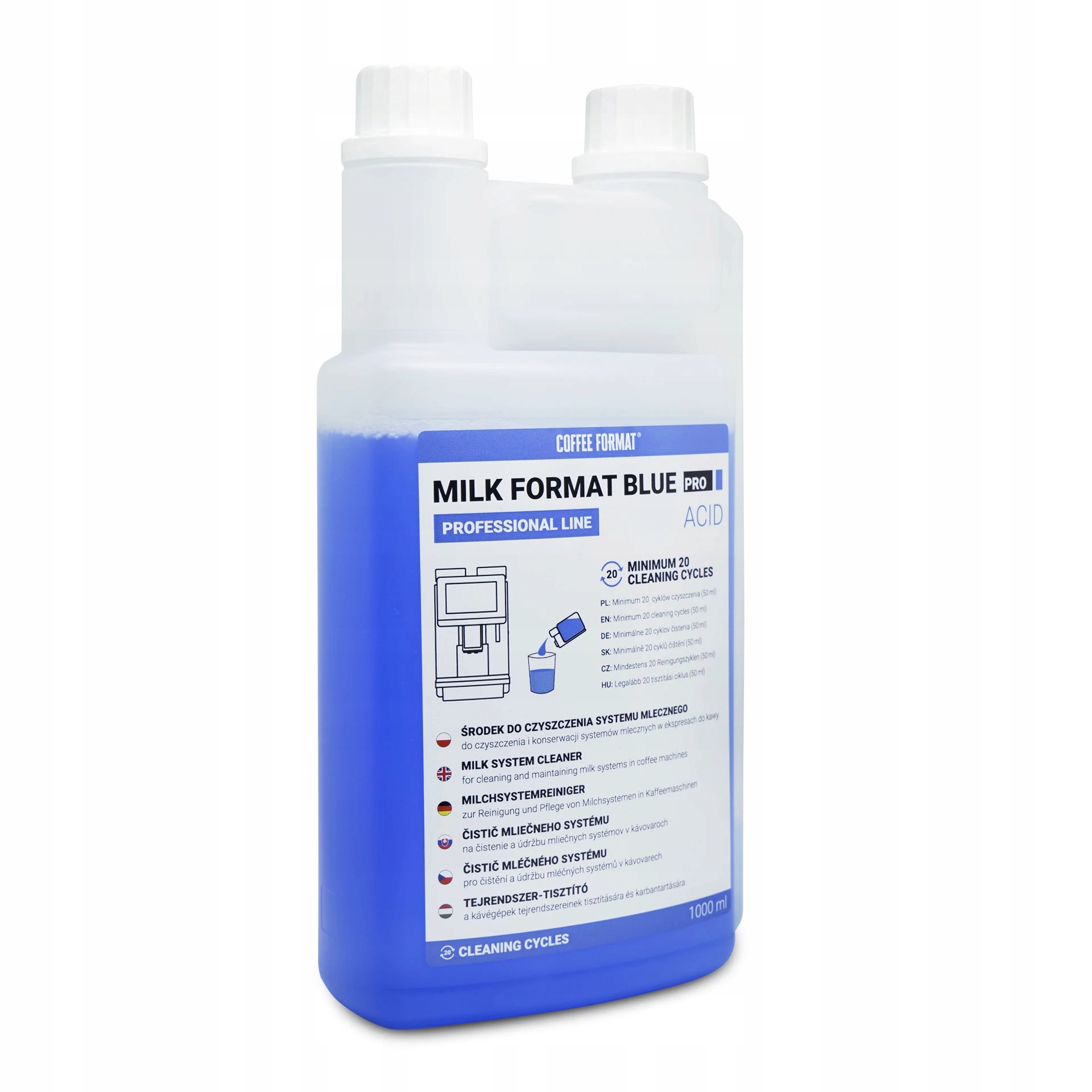 COFFEE FORMAT MILK FORMAT BLUE PRO — це професійна кислотна миюча рідина, призначена для догляду та захисту систем спінювання молока в кавоварках. Цей спеціалізований засіб було розроблено для ефективного видалення мінеральних відкладень і накипу, забезпечуючи безпеку пристрою. Очисник молочної системи міститься в зручній 1-літровій пляшці з вбудованим дозатором, що дозволяє легко підтримувати ідеальні пропорції для приготування миючого розчину. Однієї пляшки вистачає до 20 циклів очищення, рекомендована кількість рідини для одного циклу очищення становить 50 мл, яку слід змішати з 450 мл дуже теплої води.