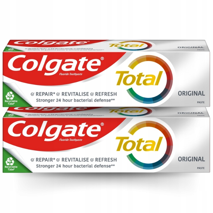 Colgate Total Original зубна паста - це продукт, завдання якого - усунути всі бактерії, знайдені в роті. Паста призначена для щоденного використання двічі на день. Цей продукт є більш ефективним навіть у 4 рази більше, ніж звичайна паста. Це зменшує бактерії на зубах, язиці, щоках і яснах. Ефекти видно через 4 тижні від першого застосування. Цей продукт містить фторид натрію.