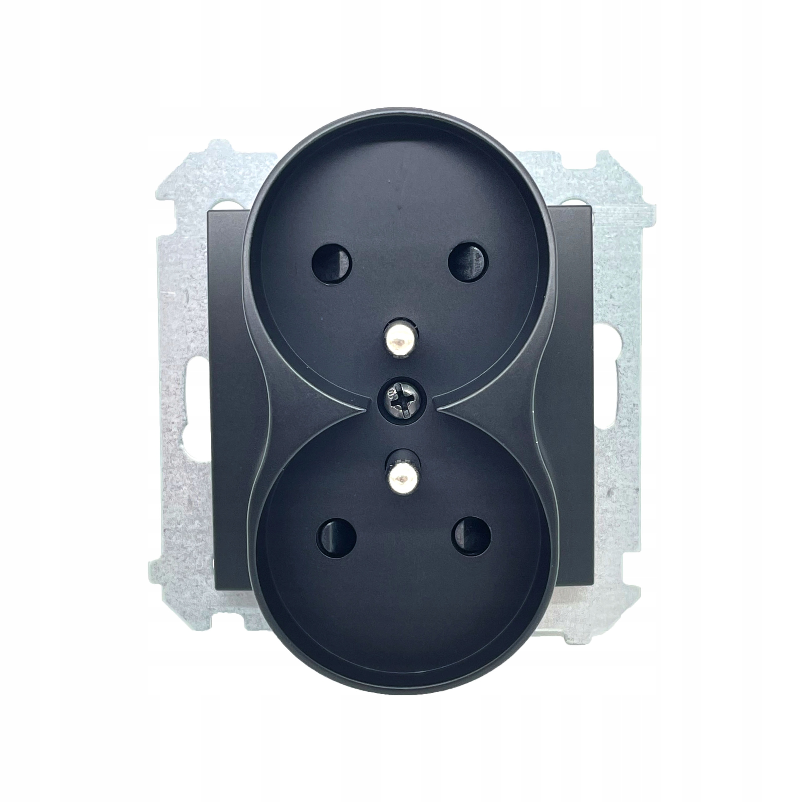 Розетка подвійна з штифтом і струмопровідними затворами (заземлення) марки KONTAKT SIMON, серія 54. Призначена для прихованого монтажу за допомогою гвинтів або засувок (захватів). Виготовлений з високоякісного матового чорного пластику і оснащений металевою опорою. Форма і колір дозволять вписати його в традиційно або сучасно мебльовані кімнати. Універсальна конструкція дозволяє легко, швидко та безпечно встановлювати як в одну, так і в декілька рам.